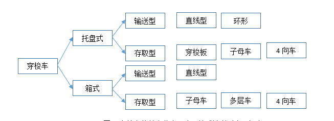 穿梭車按照輸送貨物單元類型可以分為托盤式穿梭車和箱式穿梭車,按照其作業(yè)場地不同,可分為輸送型穿梭車和存取型穿梭車。