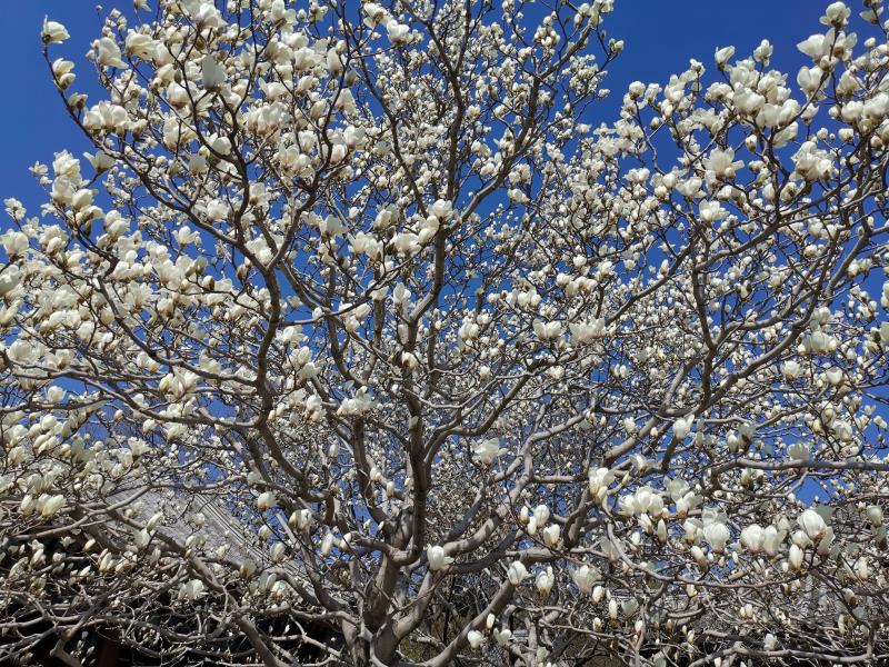 迎春花開后,緊接著就是玉蘭花。北京人特別喜歡玉蘭花,不僅每個(gè)公園會(huì)種,差不多每個(gè)學(xué)校都會(huì)種上幾株。我想,它開得早是一個(gè)原因吧,但更主要的原因還是因?yàn)楹每?。玉蘭花的顏色多種多樣,有純白色的、粉色的、紫色的、黃色的和雜色的等等,玉蘭花顏色并非特別的艷麗,卻蘊(yùn)含有一種高貴、典雅、端莊的氣質(zhì),尤其是質(zhì)地很美,有著和田子玉的暖潤和精美瓷器的質(zhì)地。玉蘭花花期較短,大概只有十多天的樣子。記得有一年的春天,我要到南方出差,走的時(shí)候看到玉蘭花含苞待放,等過了兩周回來時(shí),花已經(jīng)開始凋謝。