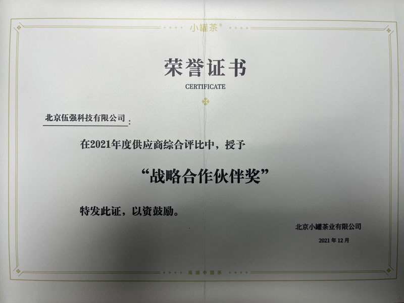 由伍強總集成的小罐茶黃山工廠是目前中國茶行業(yè)規(guī)模最大、功能最全、設施最先進、配套最完善的超級工廠。近日,伍強獲得了小罐茶客戶授予的“戰(zhàn)略合作伙伴獎”。表達了小罐茶對伍強的高度認可,對項目組成員的高度贊揚。