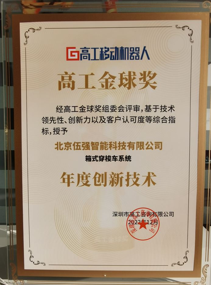 在頒獎晚宴現(xiàn)場,大會公布了高工金球獎獲獎企業(yè)名單,伍強(qiáng)智能科技憑借箱式穿梭車系統(tǒng),榮獲2022高工金球獎——年度創(chuàng)新技術(shù)。