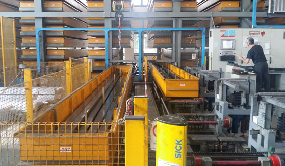中國航天運載火箭研究院物流中心面對的難題是長大件棒材的揀選問題,重量在數(shù)百公斤到數(shù)噸的鋼材很難靠人工搬運,采用堆場和橋式起重機的作業(yè)方式效率極低。新建成的自動化立體庫不僅解決了高密度存儲問題,而且解決了“貨到人”揀選問題。貨物被自動輸送到揀選工作站,通過機械臂和起重機,可以輕易完成棒材的揀選工作。在國外,這一系統(tǒng)得到廣泛應用(參見圖4)